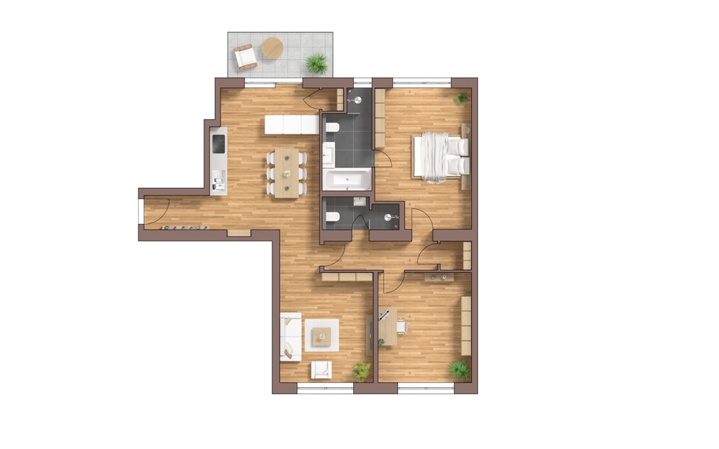 Schlafzimmer, aus dem nur Sie den Zugang zu Ihrem Badezimmer haben. Gegenüber eignet sich als 2. Schlafzimmer, Gäste-Kinderzimmer oder als ruhig gelegenes Büro. Ihr dritter Raum eignet sich perfekt als Wohnzimmer mit direktem Zugang aus der Küche heraus.